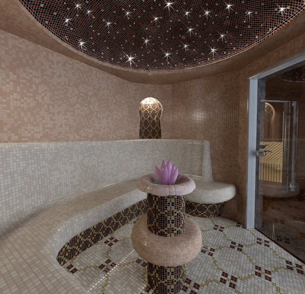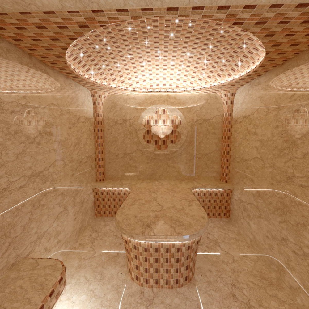 Потолок турецкой бани должен иметь форму купола. Это не дань восточным традициям архитектуры, а технологический прием – чтобы поднимающийся пар, сконденсировавшийся в капли, не капал вниз, а спокойно стекал с купола на стены и далее на пол. В хаммаме нет технологических требований к высоте потолка по сравнению, например, с сауной. Здесь больше руководствуются дизайнерскими решениями и здравым смыслом, пропорциями.