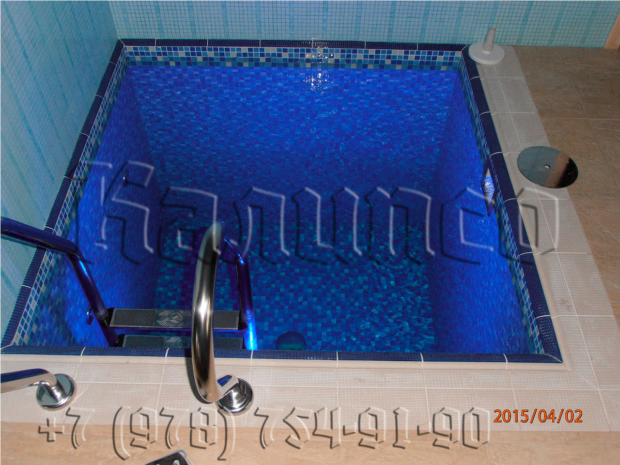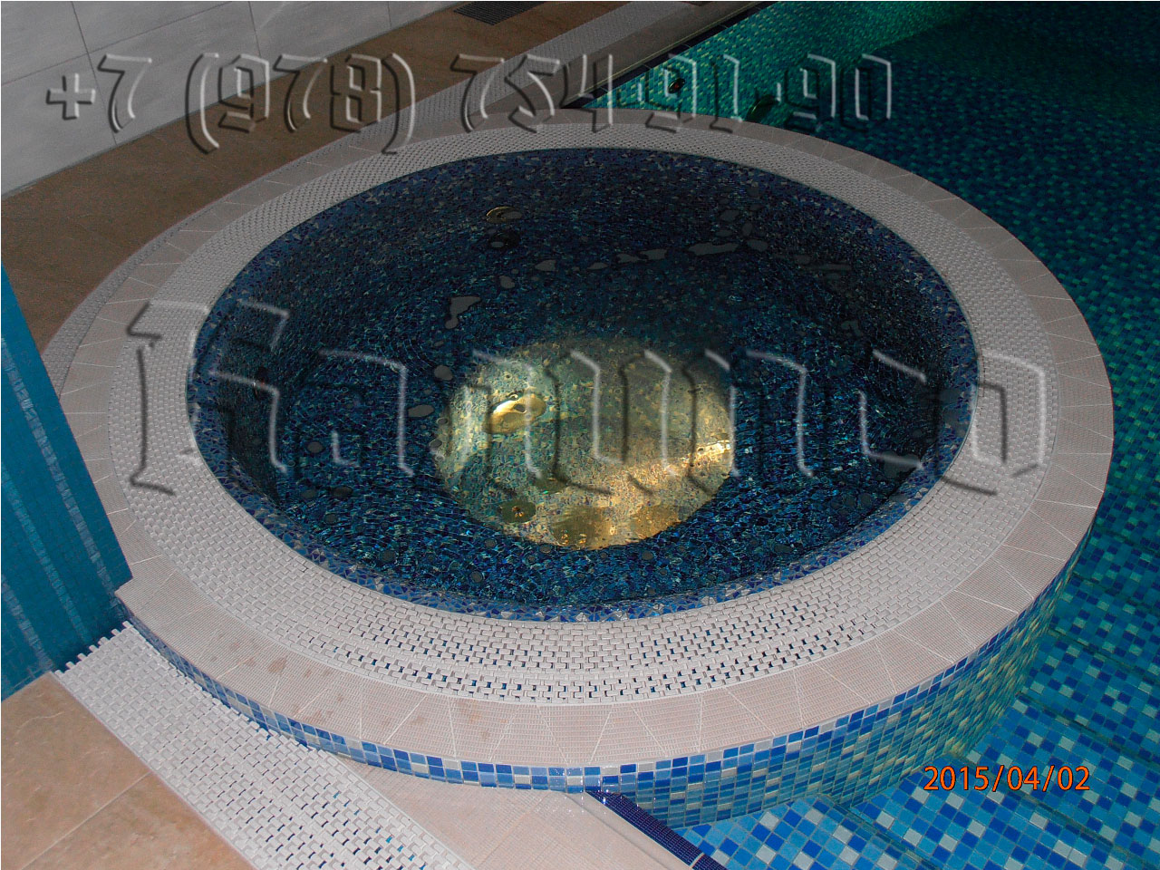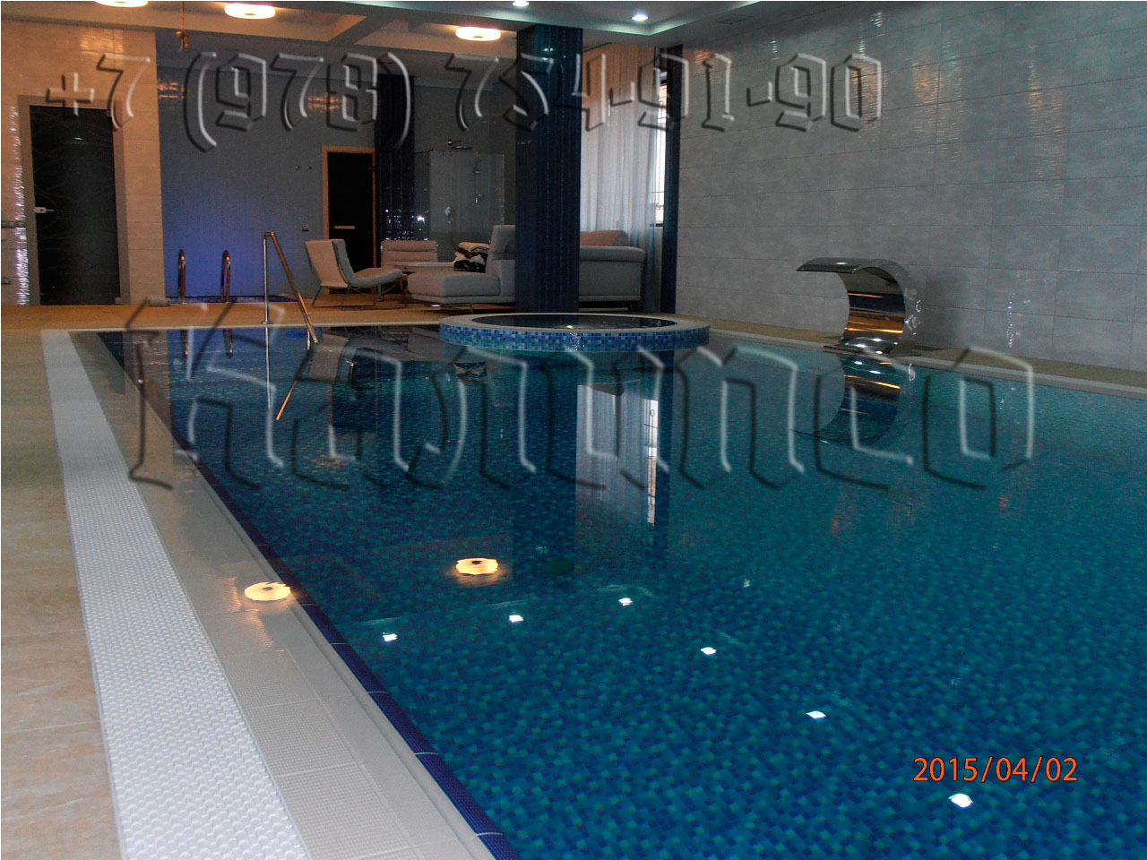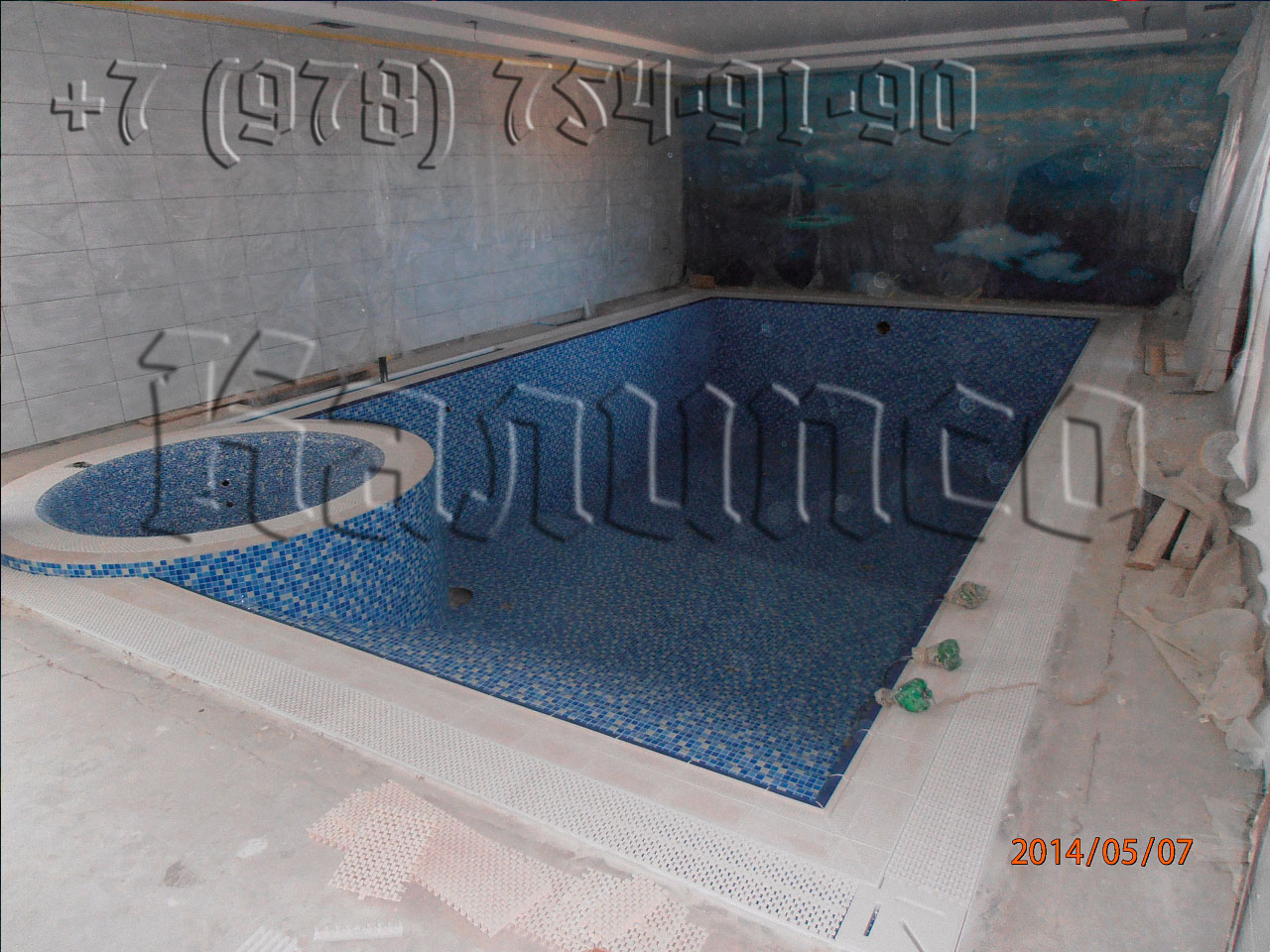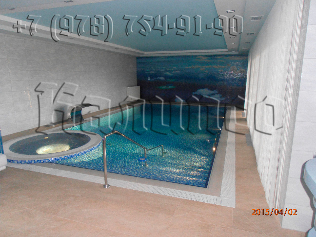 г. Ялта. Внутренний бассейн переливного типа с встроенной гидромассажной джакузи . Объемом 105м3. Бесхлорная система обеззараживание воды - Necon. Аттракционы: встречное течение, водопад, гейзер, мощный стеновой гидромассаж в бассейне. Подогрев от котла и гелиосистемы.