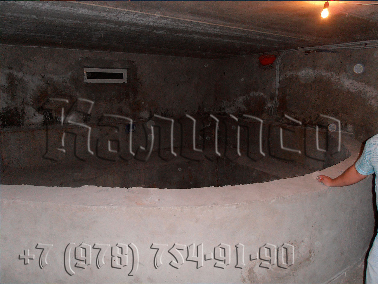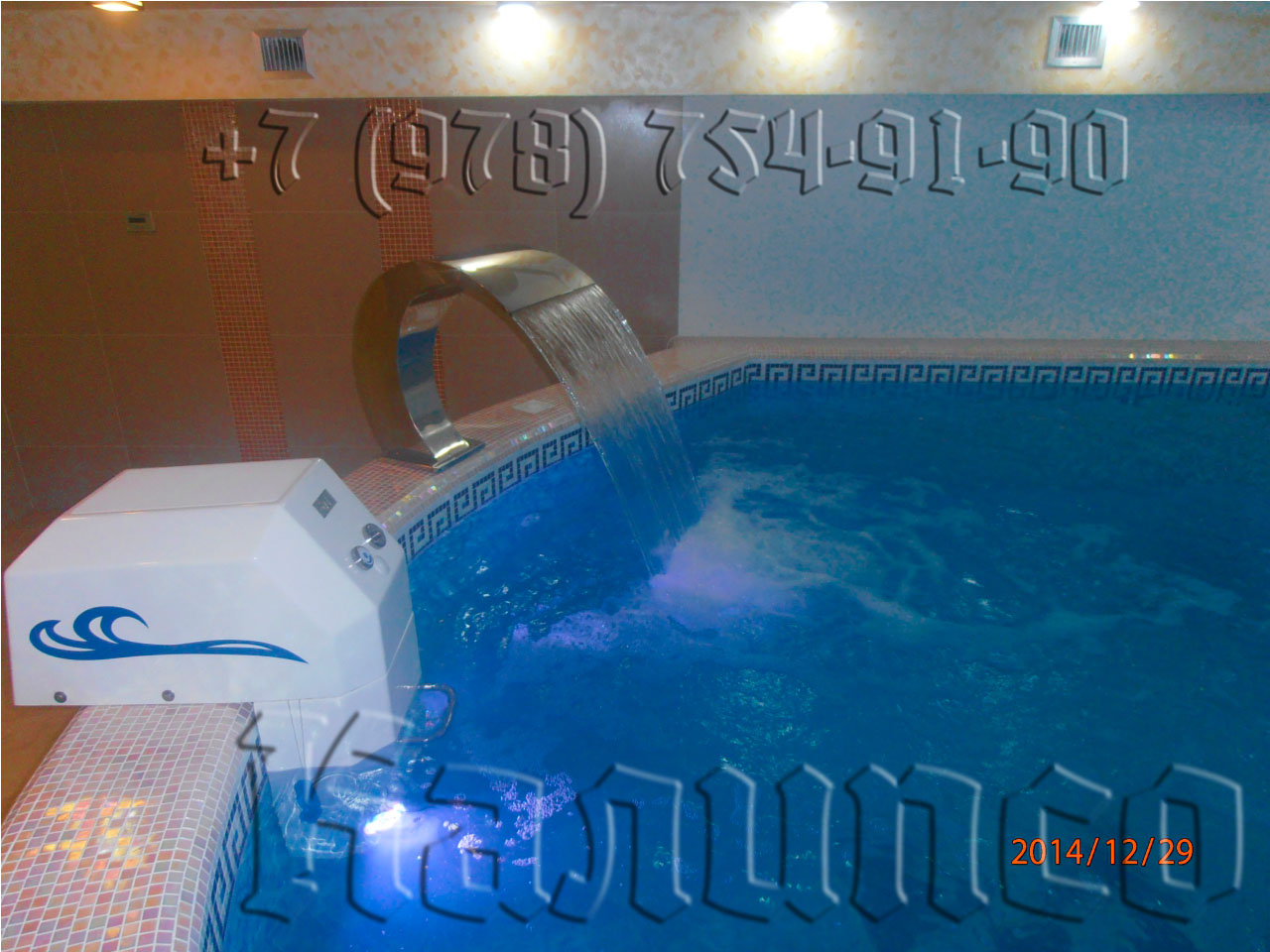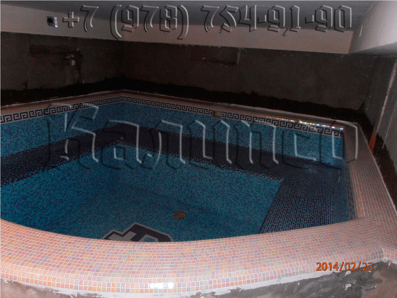 Общественный скиммерный бассейн в подвале в г. Евпатория. Бассейн облицован стекляной мозайкой, по периметру исполнен фриз (узор). Из аттракционов - водопад и навесной противоток Fitstar 63м3\ч (Германия).