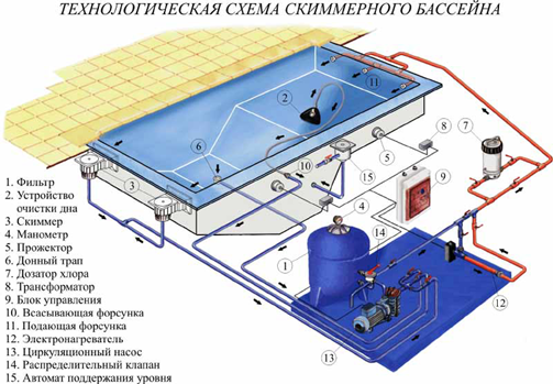 Загрязненная вода через скиммер или донный слив по трубопроводу с помощью циркуляционного насоса проходит механическую очистку в фильтровальной установке, подогревается и обрабатывается химреагентами. Затем чистая подготовленная вода поступает обратно в бассейн через подающие форсунки. Бассейн может быть оборудован станцией дозации дезинфектантов. Если в бассейне нет дозирующей системы обработка воды химреагентами может быть проведена вручную без применения дозирующих систем.
